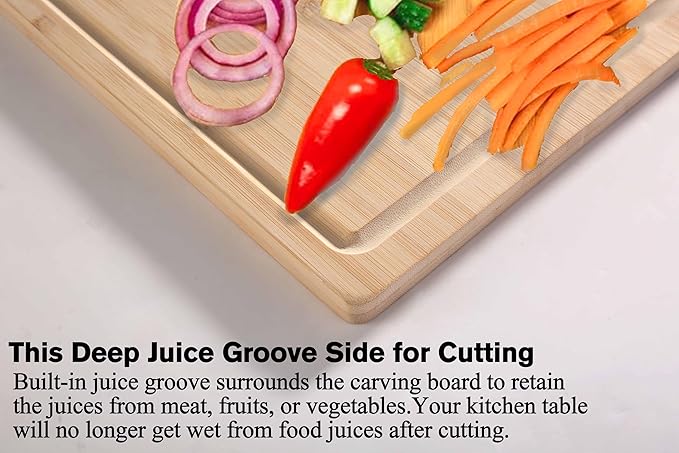 - Dual-purpose Cutting Board: The first function,Use the Deep Juice Groove side for cutting up fruits, vegetables, and carving meats like brisket, roast, prime rib, etc,Built-in juice groove surrounds the carving board to retain the juices from meat, fruits, or vegetables,Your kitchen table will no longer get wet from food juices after cooking
