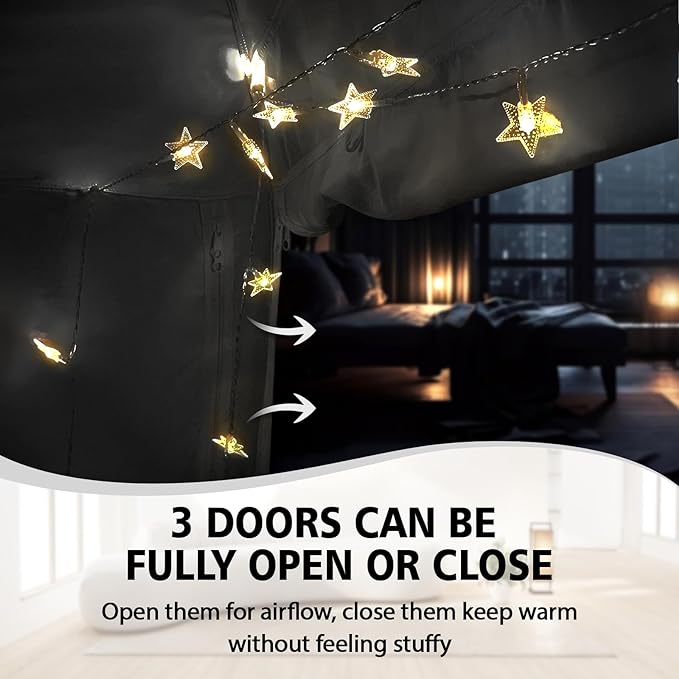 • Breathable Unstuffy: The 3 double-sided zippered doors of the bed tent can be fully opened for ventilation. when you closed 3 doors, the mesh on both sides promotes air circulation, keeping you warm without feeling stuffy.