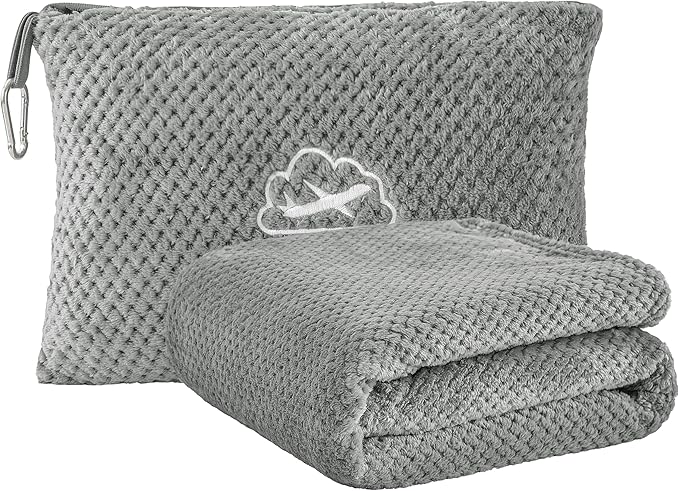 BEDELITE Travel Blanket Airplane Compact with Bag, Portable and Packable 2 in 1 Jacquard Travel Pillow and Blanket Set, Airplane Blanket Travel Essentials with Luggage Sleeve & Backpack Clip, Grey