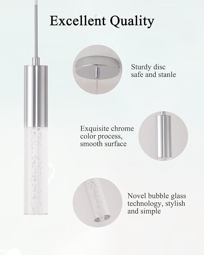 - Upgrade Your Ambient Lighting: Elevate any room with our exquisite LED pendant light. It features an aluminum tube with an electroplated paint surface, a high light transmission acrylic column lampshade, and a classic chrome spray paint finish