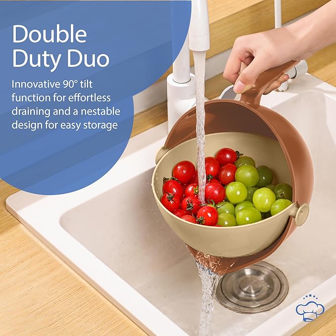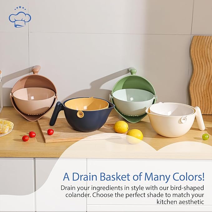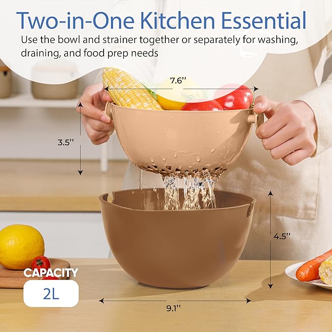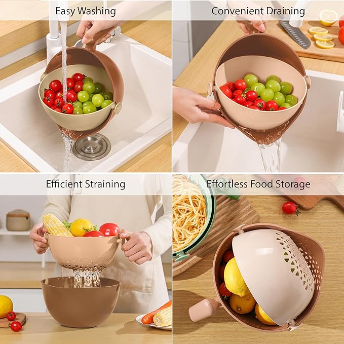 - Versatile Use. Wash, strain, and store! Our multipurpose food strainer and colander bowl set tackles any kitchen tasks. It doubles as a handy fruit washing bowl with strainer or food storage container.
