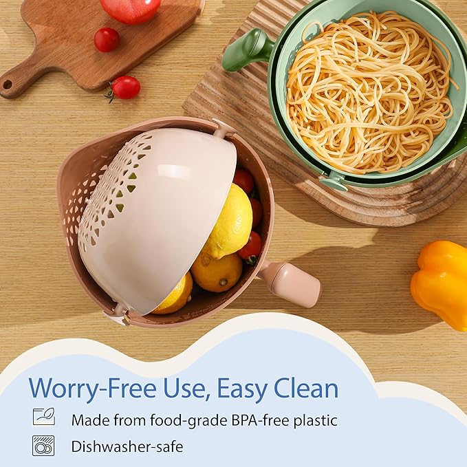 Chef's Path 2 in 1 Kitchen Strainer and Colander for Kitchen, Multifunctional Food Strainer Set, BPA Free Plastic Colander with Handle, Pasta Drainer, Veggie and Fruit Cleaner - Peach