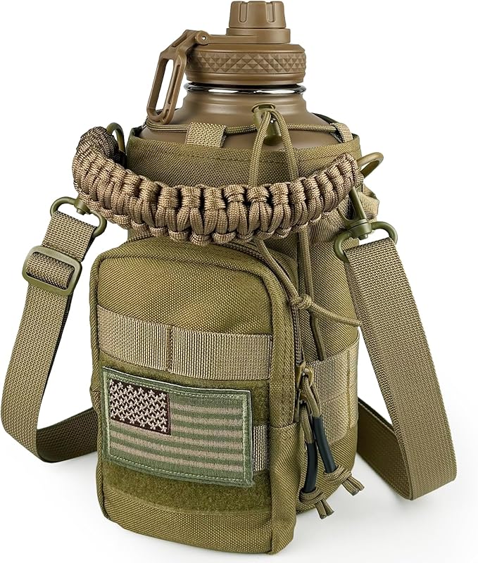 - Tactical Sports Bottle with Holder ◊ The lid with handle, the paracord handle on the water bottle sleeve, and the detachable shoulder strap provide you with a variety of carrying options and travel convenience. The front pocket can hold your cell phone, keys, and other essentials. The Mollo system offers more possibilities to carry more things with you.
