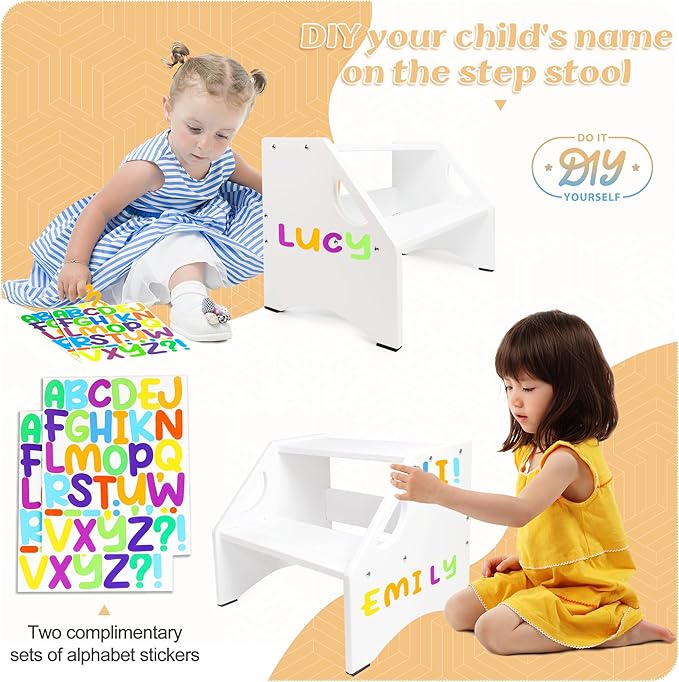 - PROVIDE SAFETY AND CONVENIENCE FOR KIDS:The top of step stool for kids adds a unique non-slip strip design that allows children to stand more stable on top of the step stool with handle to ensure that children do not slip. Also increased the side armrests to help children more easily on the potty step stool. This makes the two step stool more stable and convenient.