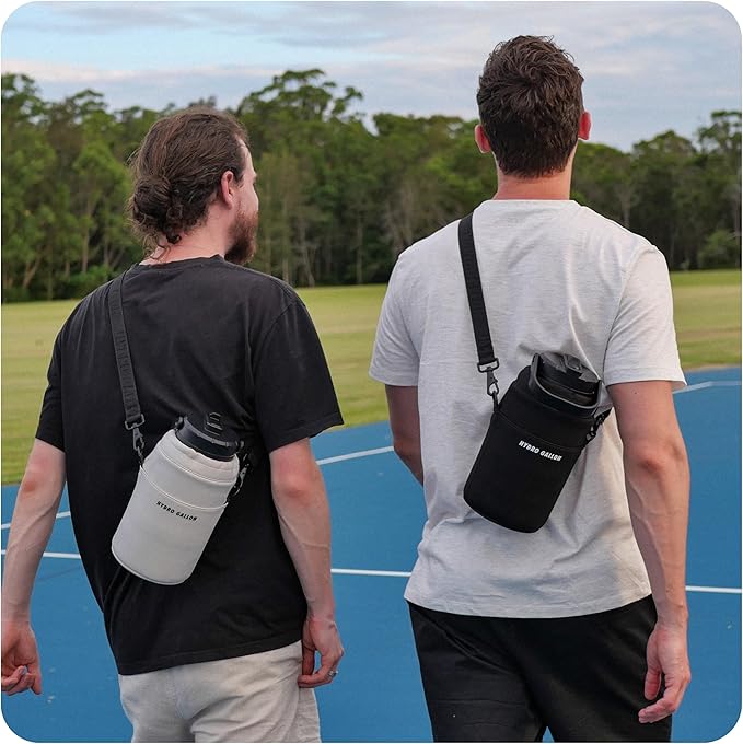 - ⦗ Hydro Gallon Sleeve ⦘ - Patented Neoprene Sleeve Holder / Sling with shoulder strap with metal fasteners, 3 pockets for your phone, keys, wallet, etc.. Drawstring to easily take off / put on the sleeve.