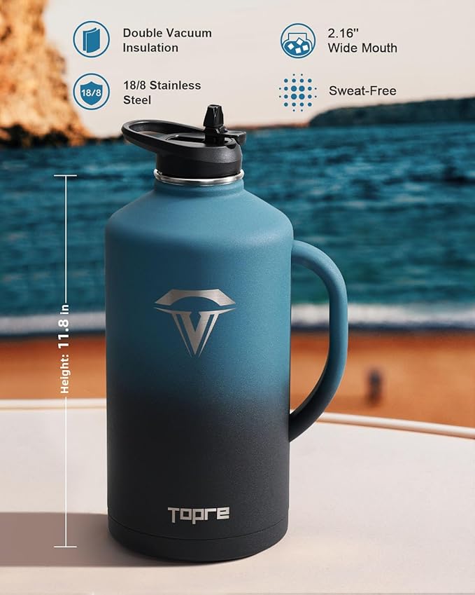 - Easy-Grip & Sturdy Handle: Topre one gallon water bottle features an ergonomic hollow design on its handle, ensuring comfortable grip and easy lifting. Perfect for effortless single-handed use while on the go. Quench your thirst with its generous 128 ounce large capacity –prompt hydration at your fingertips.