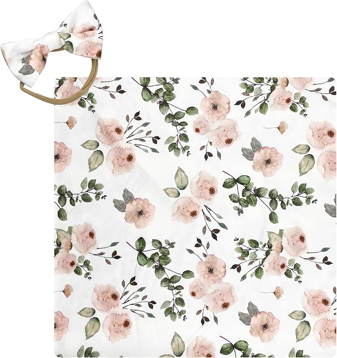 Newborn Baby Girl Swaddle and Headband Sets Receiving Blanket Stretchy Knit Swaddle Set(Green Leaf and Pink Floral)