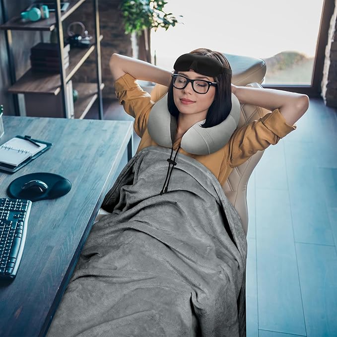 Travel Pillow and Blanket Set Neck Pillows Travel Essentials with Sleep Mask for Airplane Car Memory Foam Grey