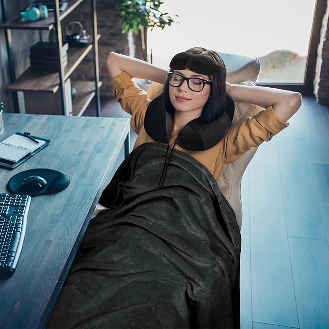 Travel Pillow and Blanket Set Neck Pillows Travel Essentials with Sleep Mask for Airplane Car Memory Foam Black