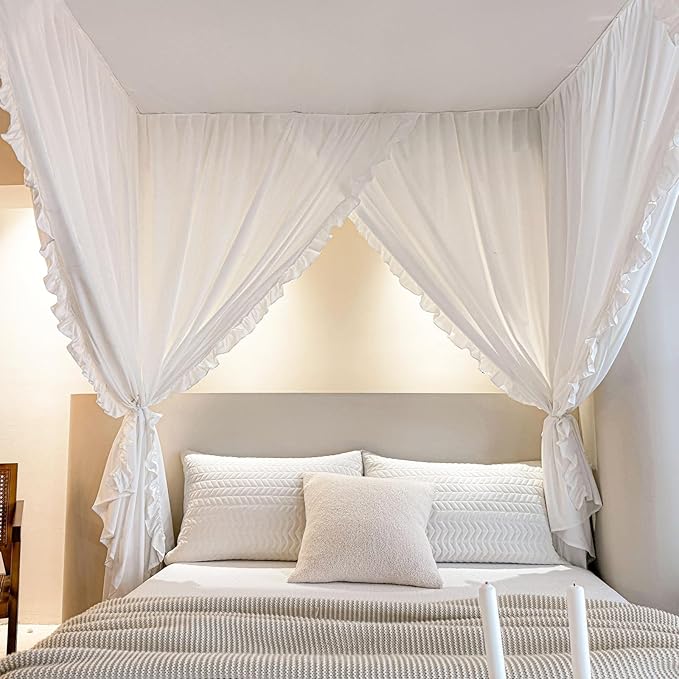AIKASY Princess Canopy Bed Curtains with Top Ties - Windproof & Lightproof for Girls' Adult Bedroom Decor | Bed Canopy Drapes (King,White)
