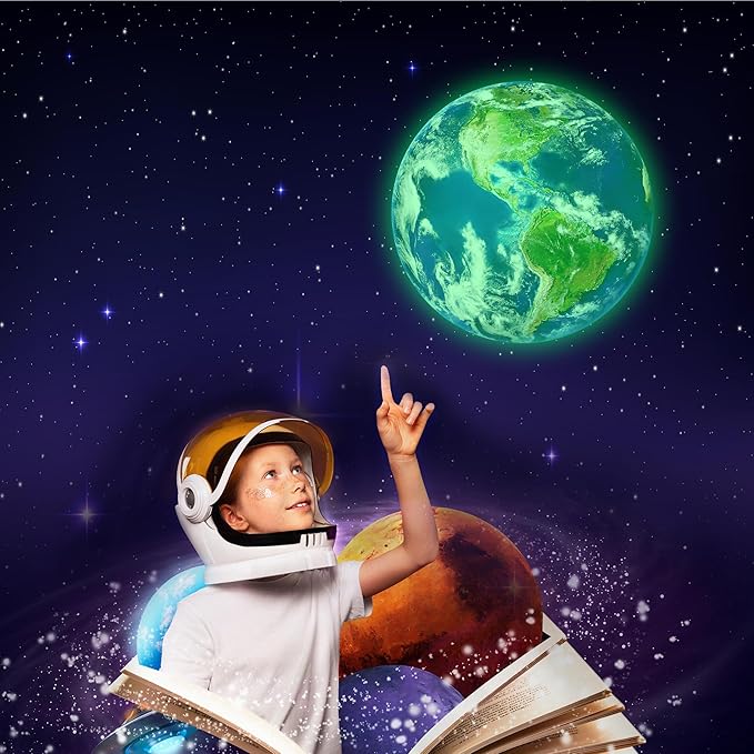 - Robmoda Glow in The Dark Planet - One piece of earth sticker made up of non-toxic, eco-friendly, waterproof, pressure resistant, shock resistant& durable fluorescent PVC. It comes in 23.5 cm (9.25”).