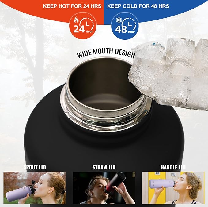 - 【DOUBLE-WALL VACUUM INSULATION】- We insulated water bottles adopt double-layer insulation wall design and vacuum sealing. This means you can enjoy your favorite hot and cold drinks for a long time, no matter what season you're in. It can keep hot drinks hot for 24 hours and cold drinks cold for 48 hours! Advanced technology prevents heat transfer to outer wall, protects your hands from the temperature of beverage.