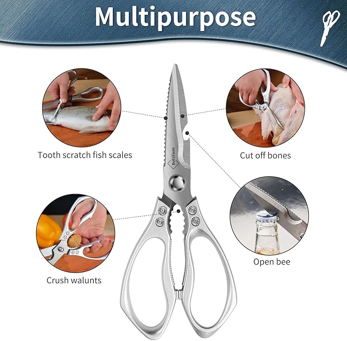 - MULTIPURPOSE KITCHEN SHEARS FOR FOOD: Ideal for cutting bone, chicken, meat, vegetables, and hard packaging; essential tool for chefs