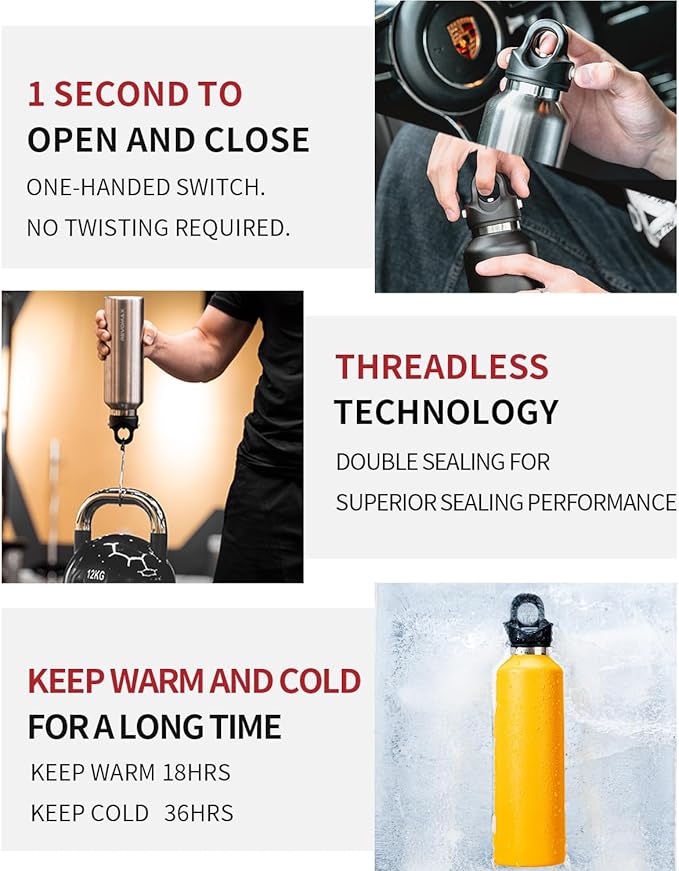 Threadless Vacuum Insulated Water Bottle - Effortless One-Hand Operation, Twist-Free, No-Screw Design - 36H Cold, 18H Hot Retention with Pressure Release Valve - 20OZ