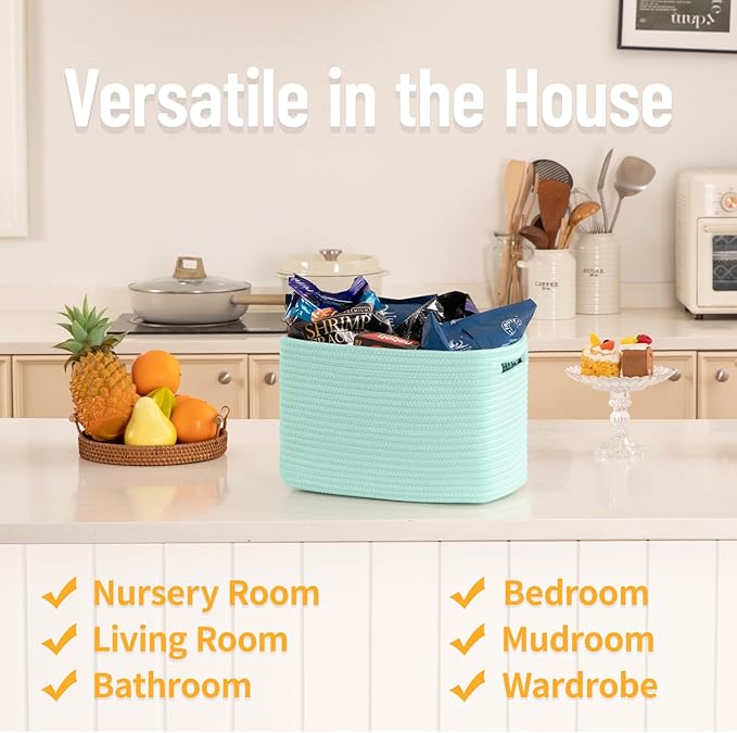 - Elegant: SIXDOVE Cotton Rope Storage Basket. The woven design of these baskets adds a touch of rustic charm to any room decor, making them a perfect addition to your living room, bedroom, or nursery. SIXDOVE rope shelf basket looks good in your shelves, closet or next to your bed and is an essential item for your daily storage. This cube rope storage basket enhances any room or décor at your home