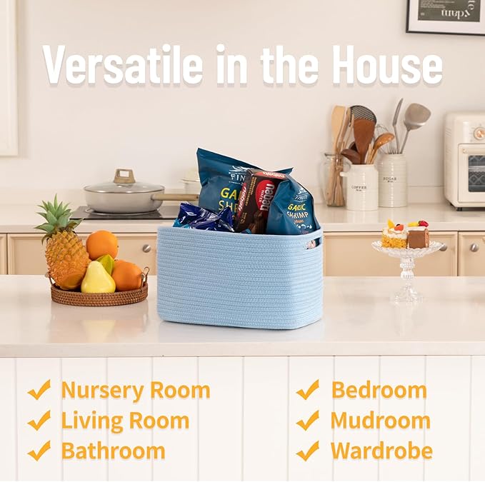 - Elegant: SIXDOVE Cotton Rope Storage Basket. The woven design of these baskets adds a touch of rustic charm to any room decor, making them a perfect addition to your living room, bedroom, or nursery. SIXDOVE rope shelf basket looks good in your shelves, closet or next to your bed and is an essential item for your daily storage. This cube rope storage basket enhances any room or décor at your home