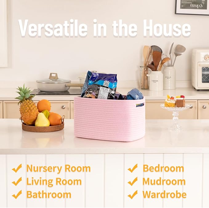 - Elegant: SIXDOVE Cotton Rope Storage Basket. The woven design of these baskets adds a touch of rustic charm to any room decor, making them a perfect addition to your living room, bedroom, or nursery. SIXDOVE rope shelf basket looks good in your shelves, closet or next to your bed and is an essential item for your daily storage. This cube rope storage basket enhances any room or décor at your home