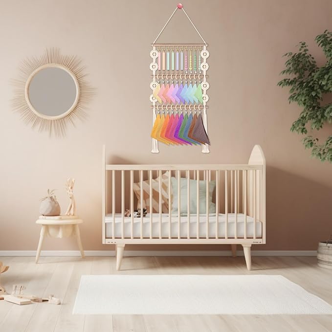 - Beautiful Design: its pleasing beige color and elegant style make this pacifier clip holder a beautiful addition to different rooms, integrating seamlessly with many decoration styles; With a size of approximately 26.38 x 13.78 inches/ 67 x 35 cm, our holder is of a compact size that fits well in many spaces while providing an adequate organizing solution; Its lightweight design and easy assembly materials make installation an easy task
