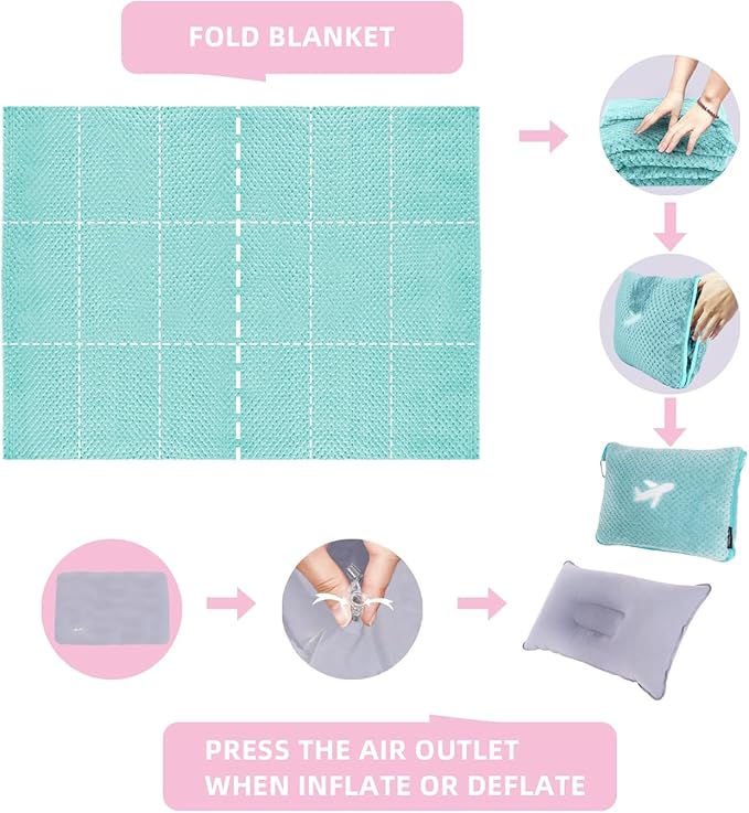 - 4) INFLATABLE PILLOW - The set also includes an inflatable pillow that fits right into the portable pouch. This gives you both a pillow and blanket in one convenient bundle. To inflate, pull up the air tube, pinch the valve at the bottom and blow into it. The design ensures the pillow won't deflate when you let go.