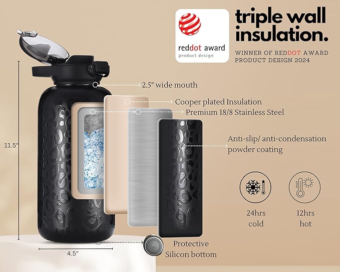 - Triple-wall Insulation for Temperature Control: Keep your drinks hot and cold for longer with our half gallon insulated water bottle. The triple vacuum insulated design ensures your beverages stay hot or cold for hours, ideal for staying refreshed during workouts, hikes, or daily activities.