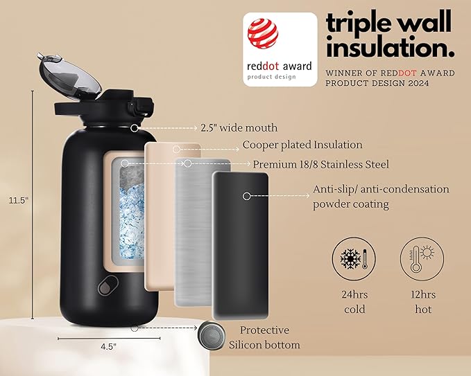 - Triple-wall Insulation for Temperature Control: Keep your drinks hot and cold for longer with our half gallon insulated water bottle. The triple vacuum insulated design ensures your beverages stay hot or cold for hours, ideal for staying refreshed during workouts, hikes, or daily activities.