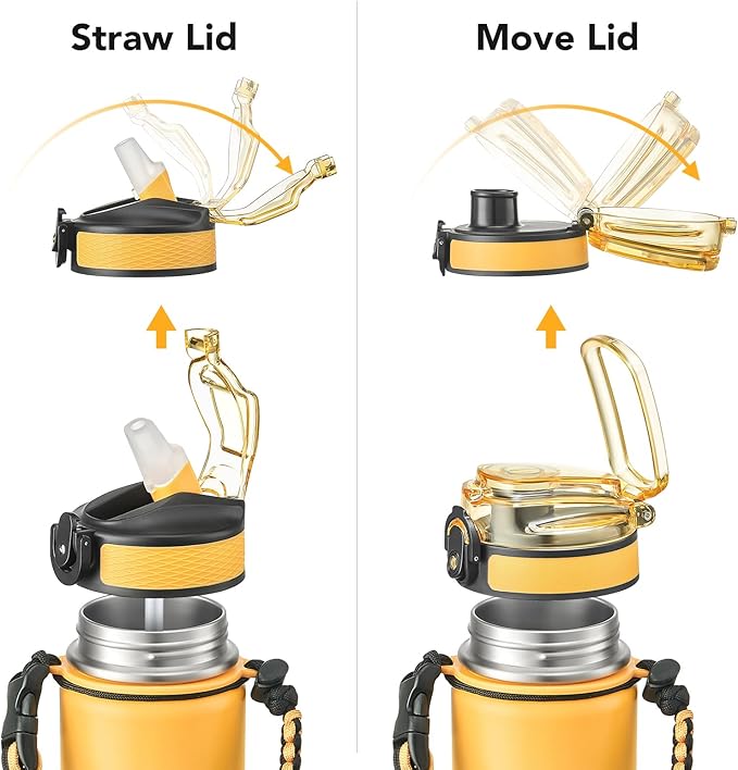 - Insulated water bottle 24 oz: 24 oz insulated water bottle has a matte finish and comes with 2 lids (Lid with Straw/No Straw) and a Paracord handle for easy portability; Its wide mouth makes it easy to fill, pour, and clean, and the leak-proof cap ensures worry transport.