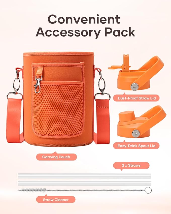 - Accessories & Warranty: With every purchase, you'll get a set of practical accessories and a lifetime warranty. The pack includes 1 x carrying pouch, 2 x lids, 2 x straws, and 1 x straw cleaner. This bottle is ideal for camping, hiking, cycling, running, gym sessions, or outdoor work, ensuring you stay hydrated wherever you go.
