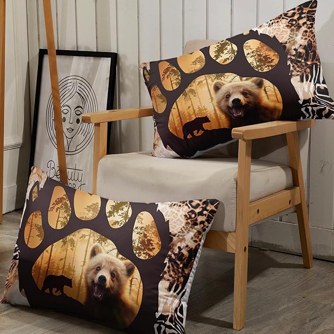 AILONEN Cute Bear Queen Fitted Sheet Set for Girls Boys, Bear Paw Sheet Leopard Print Fitted Sheet with 2 Pillowcases,3 Pieces Rustic Vintage Bear Bed Sheet Set