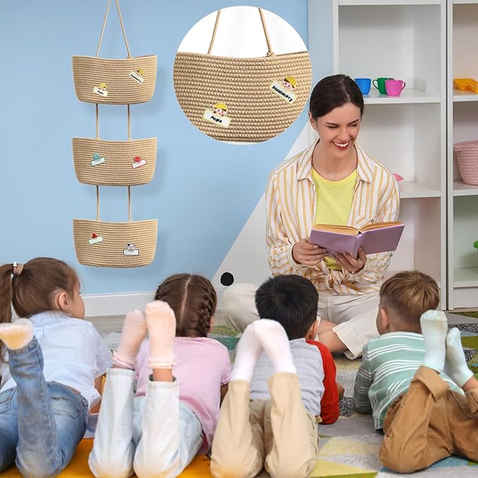 TeoKJ Over the Door Hanging Basket, 3-Tier Woven Cotton Wall-Mounted Storage Organizer Bag Decorative with Self Adhesive Write-On Sticker Hanging Nursery Baskets - Jute