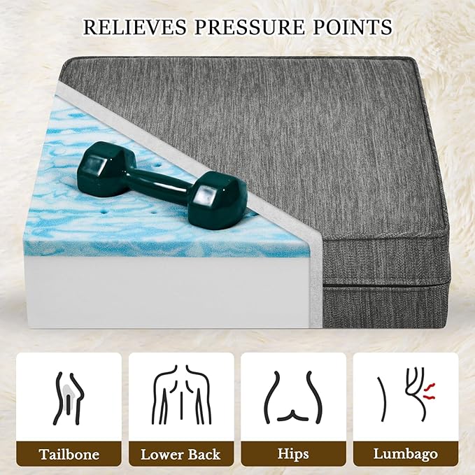 - 【Dual-Layer Foam Design】The top layer consists of premium and soft blue gel memory foam, while the bottom layer is high-density foam that provides the perfect balance of support and luxurious comfort, relieving aches and pains in your back, hips, and knees. This recliner seat cushion perfectly distributes pressure when you sit down, conforms to the ergonomic curve of the human body, effectively relieves back pain, tailbone pain, ensuring a comfortable experience. Additionally, 42 ventilation holes enhance air circulation, further maintaining a comfortable experience.