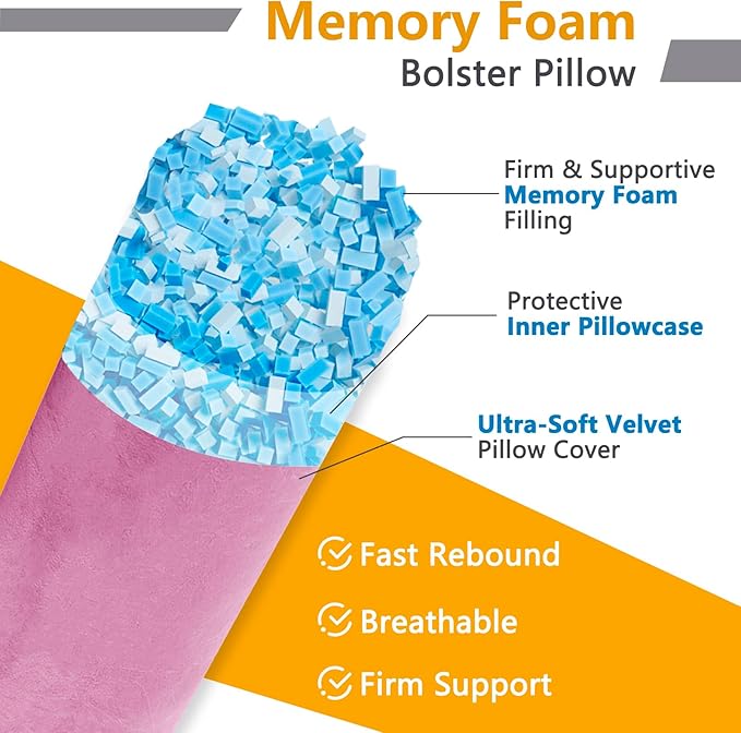 - MEMORY FOAM BOLSTER PILLOWS: Stuffed with high-end shredded memory foam, our bolster pillows set provides outstanding sleeping comfort, memory foam is more breathable and durable, stay firm and never loses shape, making these long round pillows perfect for adults sleeping and support.