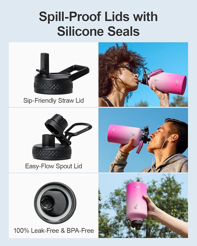 - No Leaks, No Worries: This stainless steel water bottle ncludes two leak-proof lids—a straw lid and a spout lid. Both are equipped with silicone rings to prevent any spills or leaks, and are completely BPA-free for your peace of mind.