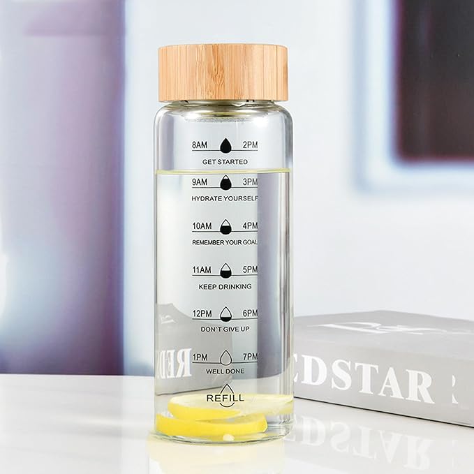 - 25oz large capacity: The glass water bottle with time stamp has a large capacity of 25oz, which is suitable for most people's daily water intake. The wide mouth opening is easy to fill with water, ice cubes or fruit, and the leak-proof lid is convenient to carry.