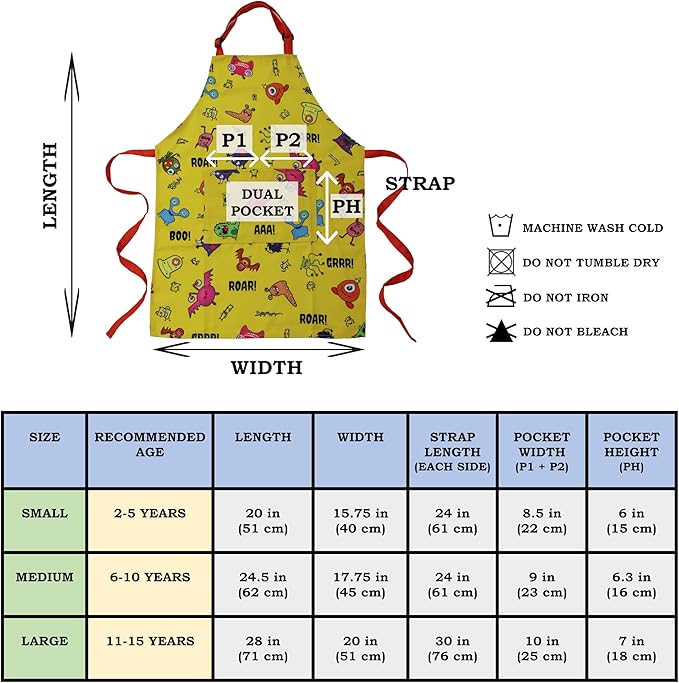 • THREE SIZES FITS KIDS 2-15 YEARS – (Small - 2 to 5 years, Medium – 6 to 10 years and Large - 11 to 15 years). For details about size, refer to the images. Apron features (1) Adjustable neck buckle/strap makes it easy to put on and take off the apron. It also accommodates the needs of a rapidly growing child. (2) Long and sturdy waist tie aids a perfect fit. (3) Dual front pocket provides plenty of room for small tool / tools, accessories, art / craft supplies and keeps hands free.