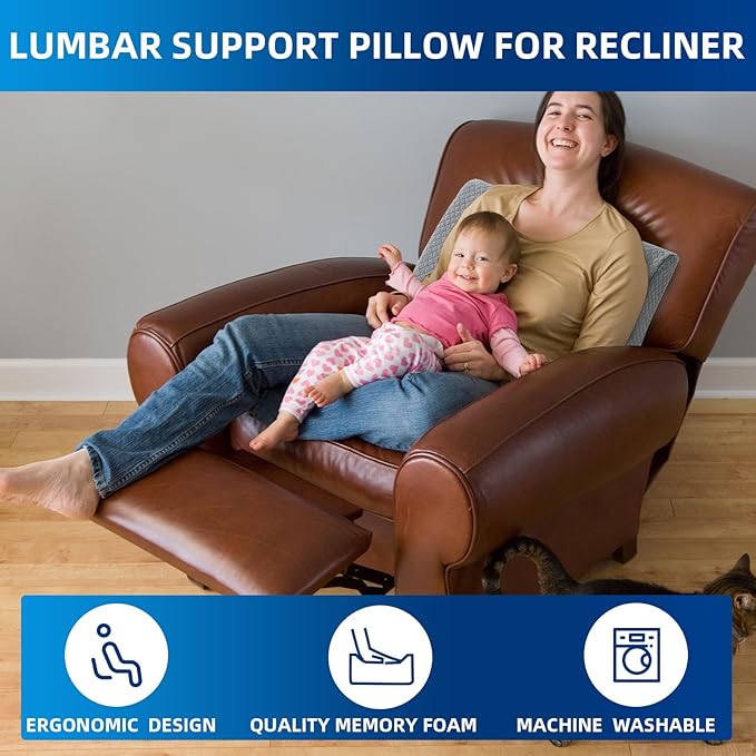 - 【Designed for recliners】 Measures 20"x14"x5", wider and thicker sides cover the entire lumbar and lower back. Perfectly sized to support your entire back, the recliner lumbar pillow fits your recliner, armchair and sofa. Make you feel relaxed and at ease.