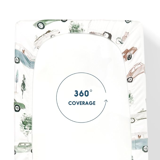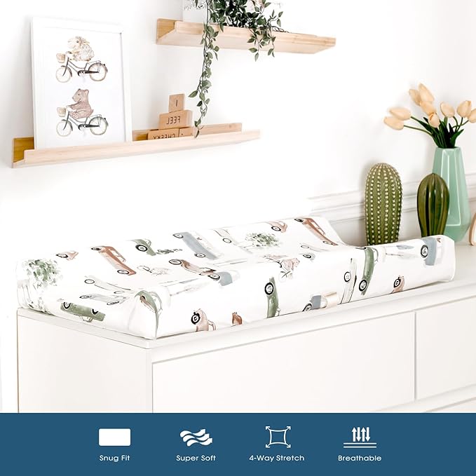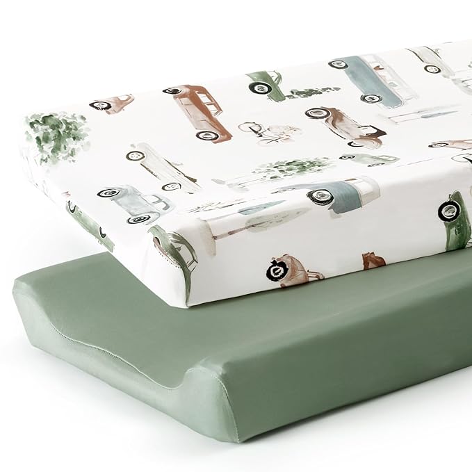 GRSSDER Stretchy Ultra Soft Jersey Knit Changing Pad Cover Set 2 Pack, Change Table Pad Covers Fit 32"/34" x 16" Pads Safe and Snug, Pretty Diaper Changing Pad Covers of Car Print