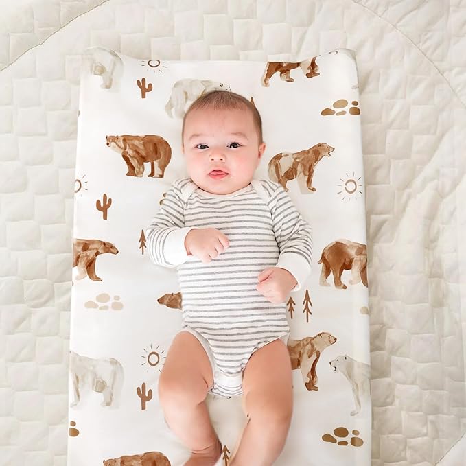 GRSSDER Stretchy Ultra Soft Jersey Knit Changing Pad Cover Set 2 Pack, Change Table Pad Covers Fit 32"/34" x 16" Pads Safe and Snug, Cute Diaper Changing Pad Covers of Sunny Bear Print