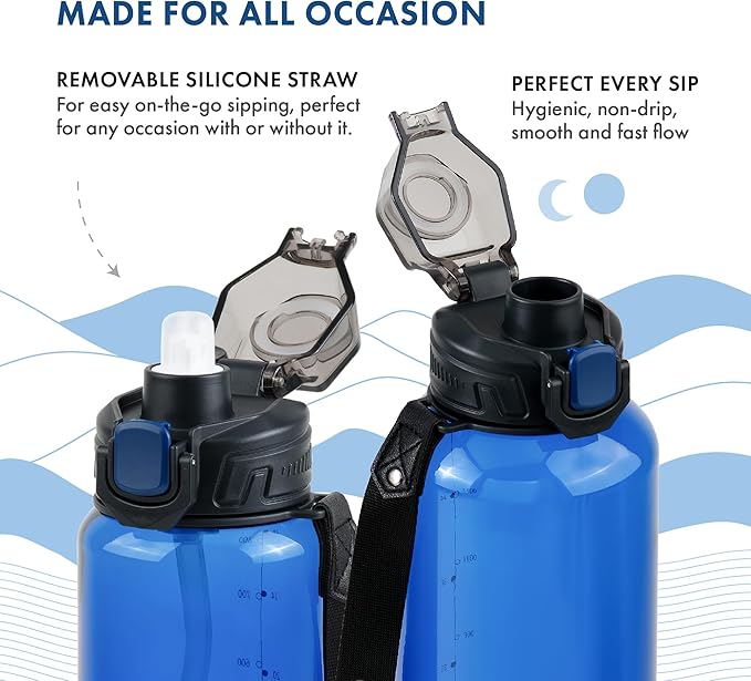 - Convenience Meets Style - Embrace convenience and style with our large water bottle and its large carry strap. Elevate your hydration experience, ensuring the bottle is always within arm's reach during any activity. Big water bottle with measurements provide an easy way to track water consumption.