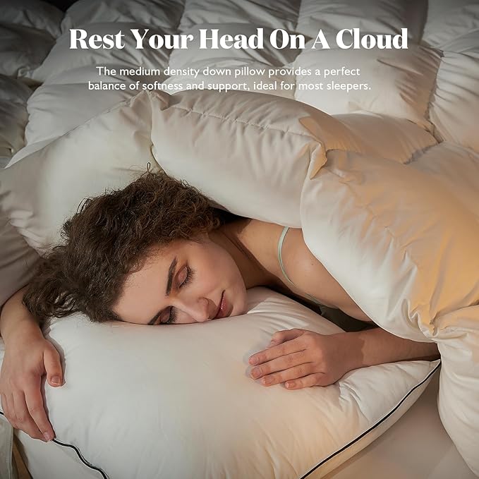 - ๐๐จ๐จ๐๐๐ฒ๐ ๐๐ง๐ฌ๐จ๐ฆ๐ง๐ข๐๏ผThis goose down pillows standard features a medium density filling that is soft yet supportive when your head sinks in, providing better neck support and maximum comfort for your head and shoulders