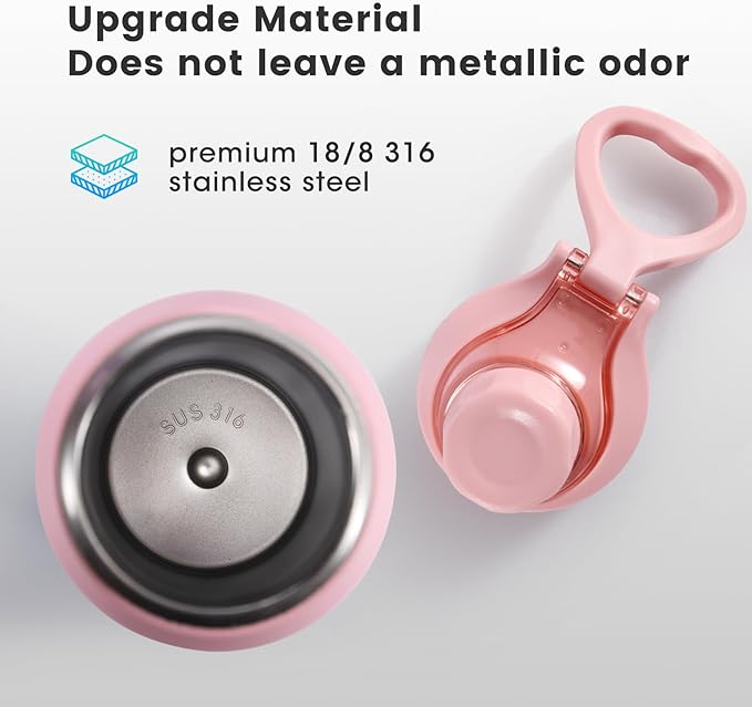 - Made of 18/8 316 food grade stainless steel, the water bottle is durable, it will never leave a metallic taste or rust. Portable carrying handle design makes it easy to carry around on a daily basis. Its wide mouth opening makes filling and cleaning your ice cubes quick and easy.
