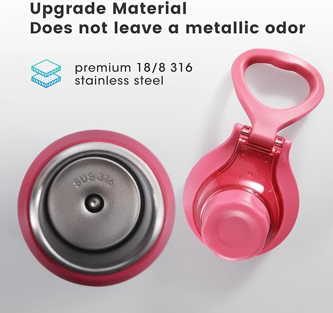 - Made of 18/8 316 food grade stainless steel, the water bottle is durable, it will never leave a metallic taste or rust. Portable carrying handle design makes it easy to carry around on a daily basis. Its wide mouth opening makes filling and cleaning your ice cubes quick and easy.