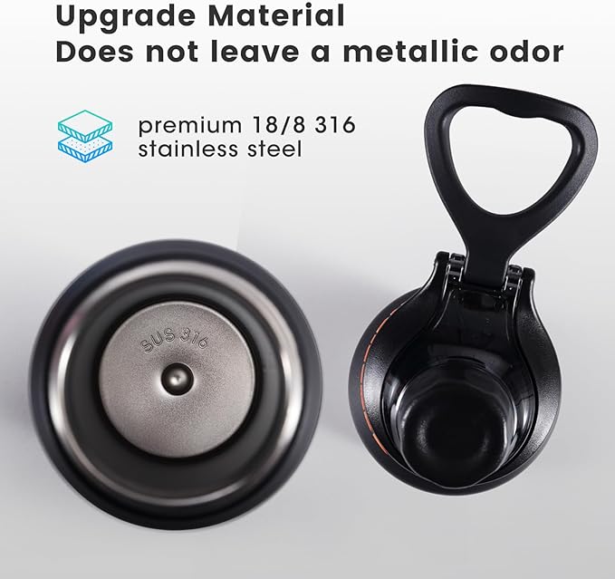- Made of 18/8 316 food grade stainless steel, the water bottle is durable, it will never leave a metallic taste or rust. Portable carrying handle design makes it easy to carry around on a daily basis. Its wide mouth opening makes filling and cleaning your ice cubes quick and easy.
