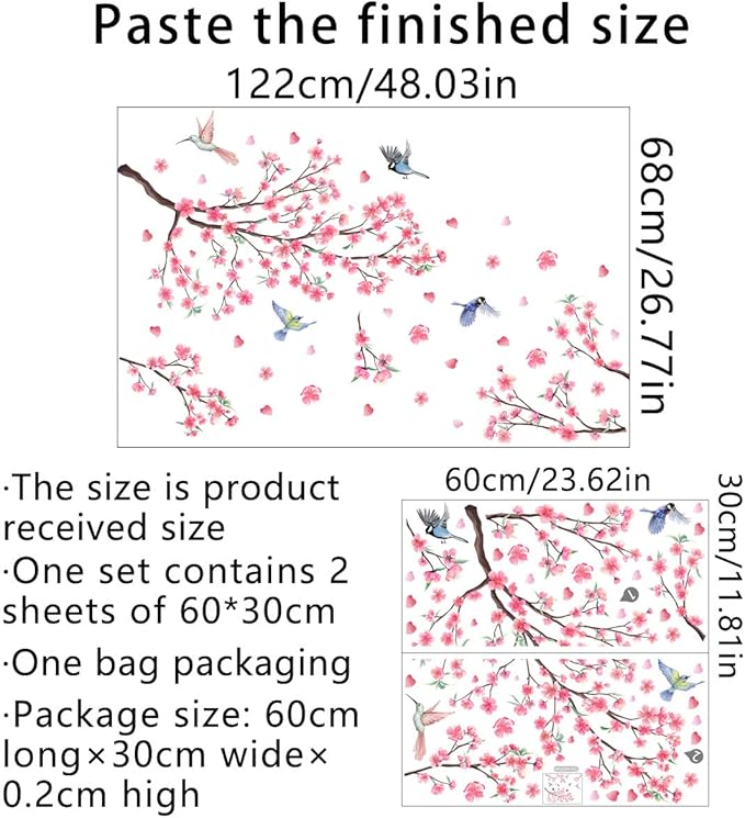 - 🌺【Stylish Pattern】Pink peach blossom wall decals, peach branch bird print art and modern design into an eye-catching mural. This sticker is very suitable for nursery, bedroom, playroom, living room, adorable kids room decor.