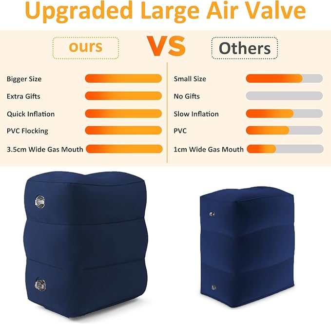 - Double Cap Valve - Our inflatable foot rest pillow with 2-in-1 double valve,the upper black air valve is a one-way air inlet for inflating or replenishing gas.bottom transparent air valve can be quickly inflated and deflated,when you are done blowing it up, push clear cover on and push whole valve in so that it is flush with the side of the travel foot pillow,the airplane footrest takes away the hassle of bringing a pump and making noise in flight.