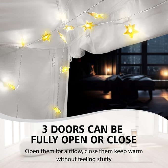 - Breathable Unstuffy: The 3 double-sided zippered doors of the bed tent can be fully opened for ventilation. when you closed 3 doors, the mesh on both sides promotes air circulation, keeping you warm without feeling stuffy.
