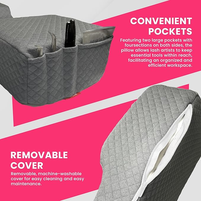 - [POCKETS ON BOTH SIDES] - Eyelash pillows for bed features two big pockets with four sections on both sides of the lash pillow for lash extensions so that lash artists can stay organized and have all the essential tools a few inches away from lash artists' arms.