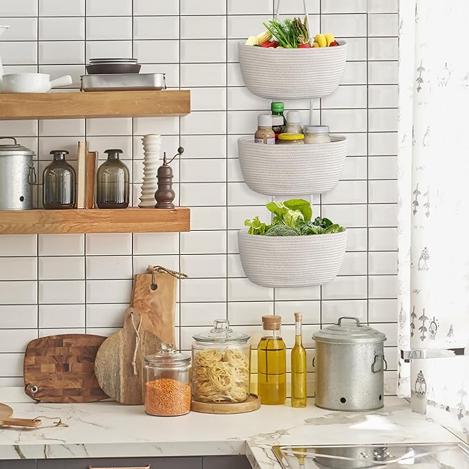 - STRONG AND DURABLE: Hanging rope baskets are made of soft but sturdy woven cotton cord, made by experienced craftsmen who take great care in sewing and detailing, so the hanging 3-tier storage baskets have a strong load-bearing capacity