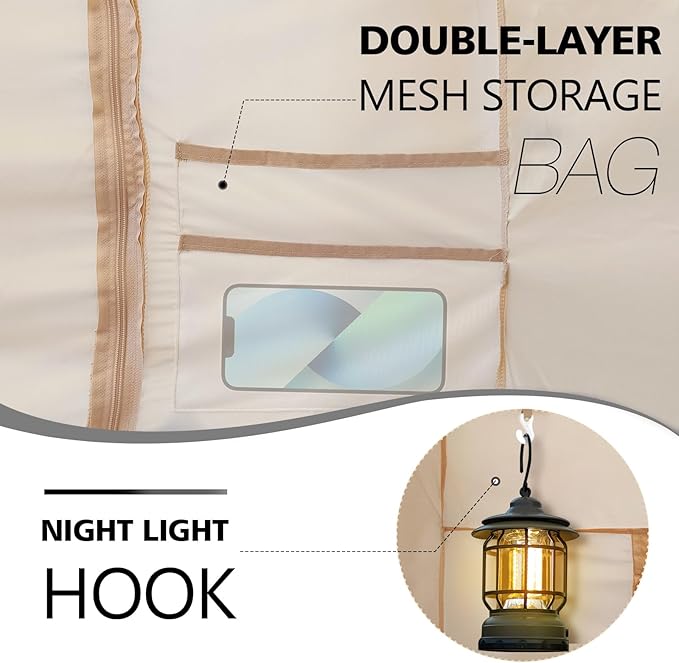 - Multifunctional Use: There are 2 double mesh storage pockets inside the bed tent to place items. 2 velcro opening to place the charging cable, and 2 night light hooks. Reflective zipper pulls allow you to quickly find the zipper door in the dark