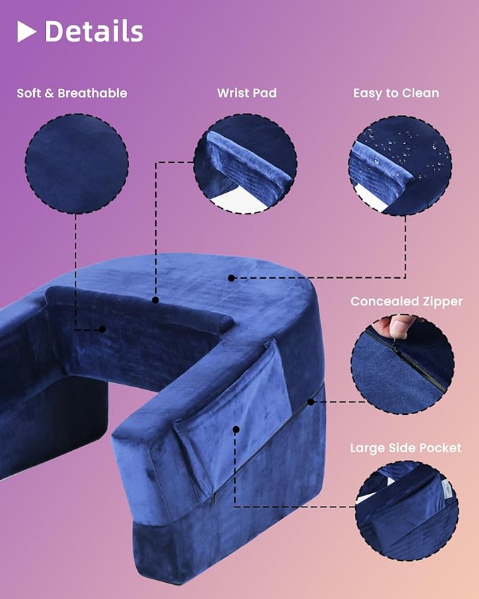 - 【Arm Support】 The reading pillow with a longer and wider arm rest, providing enhanced support for your arms, allowing for a more relaxed position and relieving tension in the hand muscles.The ergonomic design tilted desktopcan keep your eyes at a reasonable distance from the phone and laptop, which protects your eyesight. Its curved U-shaped groove design conforms to body contours, reducing strain on your neck and back.