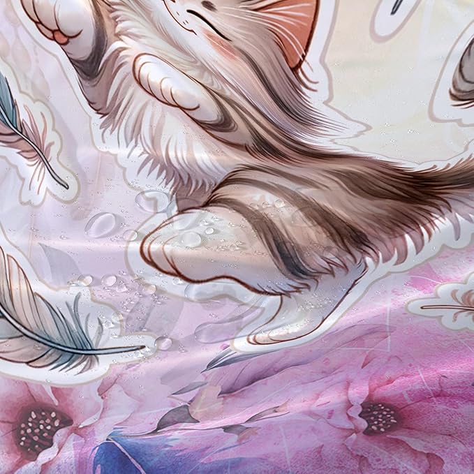 AILONEN Cartoon Cat Shower Curtain,Kawaii Dance Kitten and Feathers Bathroom Curtain Set for Kids Boys,Cute Animal Kittens Waterproof Shower Curtain for Bathroom, 72" W*72" H Pink